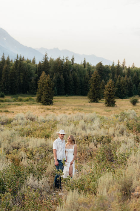 Guys. When I say that this was a career highlight, I'm not lying! In the year 2025 I got to photograph in not one but TWO national parks, and as you can tell by the Tetons in the back, I got to photograph these engagements in Grand Teton National Park. All the stars aligned; the mountains were clear, the sunset was gorgeous, their colors were perfect, and we got to travel.